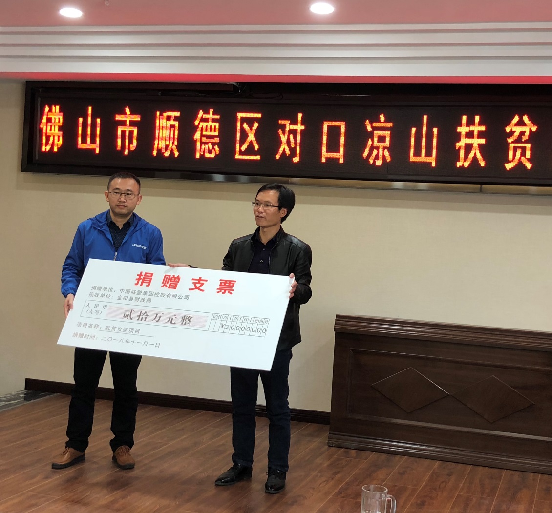 會上,袁秘書介紹了中國聯塑集團概況及履行企業社會責任等情況。2018年,中國聯塑以實際行動支持涼山州的教育事業,并對口援助精準扶貧項目,截至10月份,中國聯塑累計捐贈物資和捐款達110多萬元。2018年3月,四川聯塑捐贈涼山州布拖縣九都鄉中心校安全飲水工程項目管材、管件等物資價值18萬余元。10月份,四川聯塑為布拖縣拉達鄉中心校安全飲水工程捐贈價值20余萬元管材管件。今年6月份,由佛山市順德區扶貧開發工作領導小組主辦,順德區扶貧開發協會承辦的2018順德區扶貧開發“愛心之夜”晚會上,中國聯塑集團捐贈100萬元人民幣,其中60萬用于涼山州美姑、金陽、雷波三個縣的精準扶貧項目。