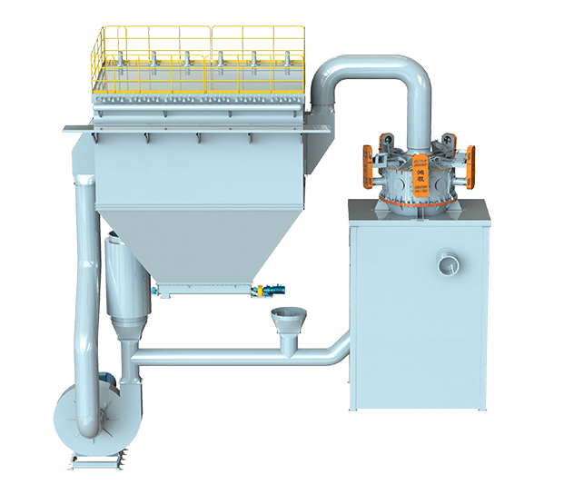 開路系統:物料通過給料機定量進入進料管道,與系統進風混合均勻后,由下端入料口進入分級機,符合粒徑要求的細顆粒隨氣流進入脈沖收集器,粗顆粒夾帶部分細顆粒沿筒壁下降至二次風處,經二次風的淘洗作用,使粗細顆粒分離,細顆粒上升至分級區進行二次分級,粗顆粒下降至下料口排出。